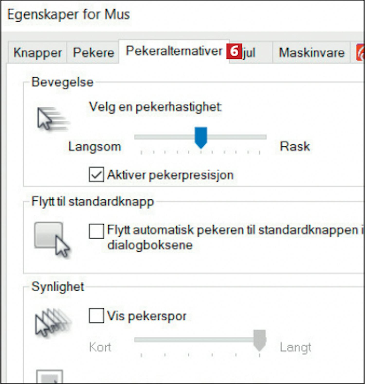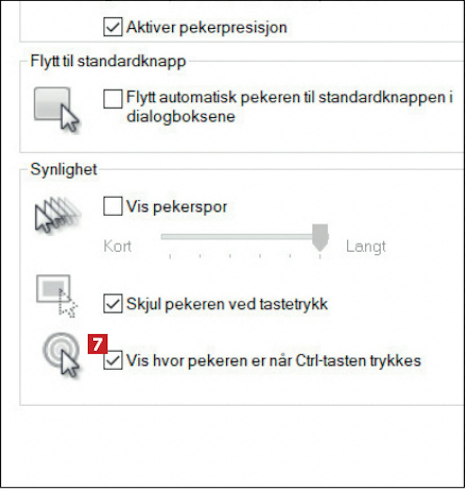 Sett hake ved Vis hvor pekeren er når Ctrl-tasten trykkes 7 . Klikk på Bruk og OK.