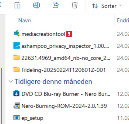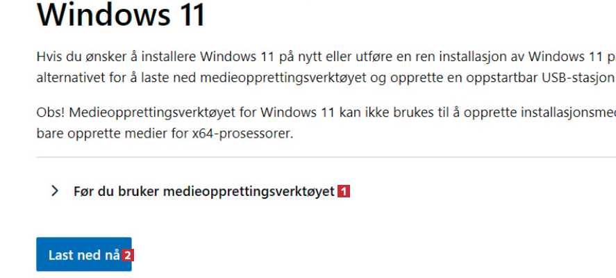 Gå til microsoft.com/nb-no/software-download/windows11 i nettleseren. Under Før du bruker medieopprettingsverktøyet 1, velger du Last ned nå 2.