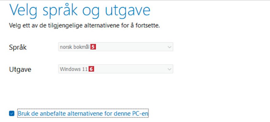 Velg norsk 5 og Windows 11 6. På den måten sørger du for at du får den nyeste Windowsversjonen på norsk. Klikk på Neste.