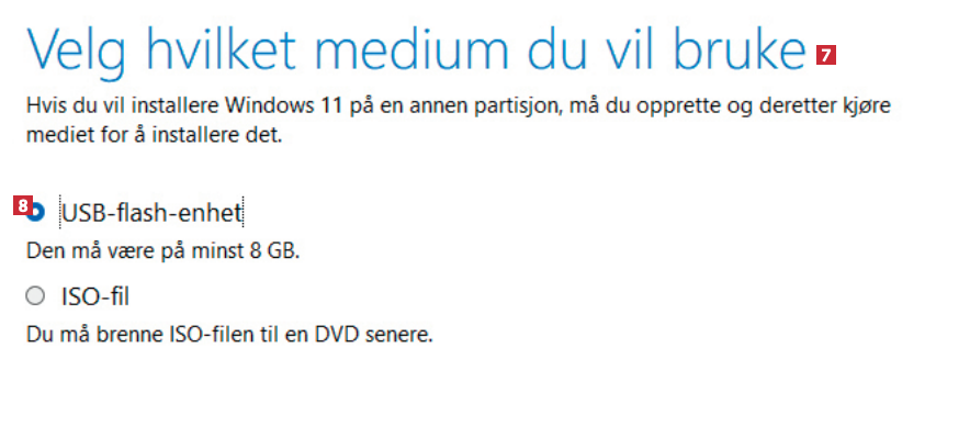 Koble den første minnepinnen til maskinen. Når du kommer til Velg hvilket medium du vil bruke 7, velger du USB-flash-enhet 8, som er et annet ord for minnepinne.
