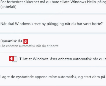 Bla ned til Dynamisk lås 5, og utvid menyen. Fjern haken ved Tillat at Windows låser enheten automatisk når du er borte 6.