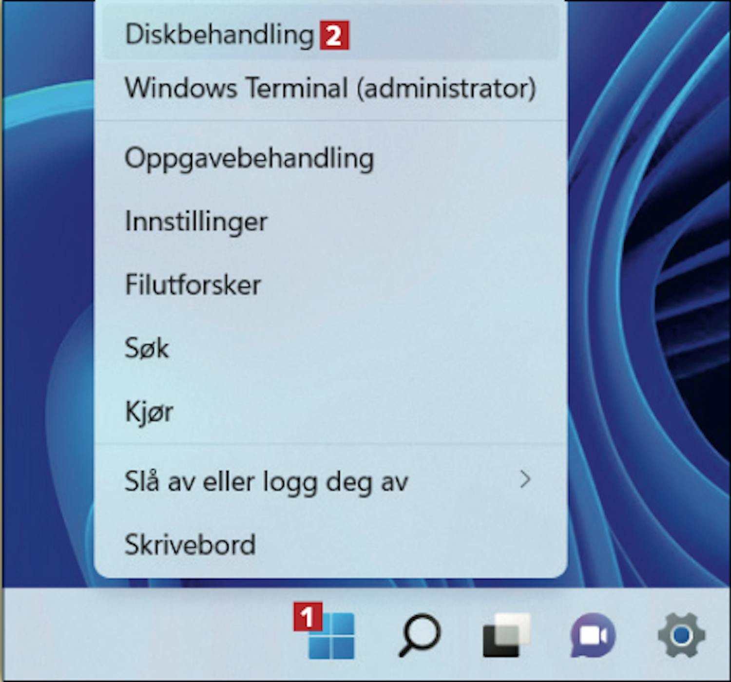 Høyreklikk på startknappen i Windows 11 1 . Velg Diskbehandling 2 .
