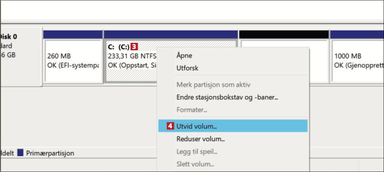 I Diskbehandling høyreklikker du på stasjonen 3 du vil utvide plassen til (altså den som nå er på 250 GB hos deg). Velg Utvid volum… 4 .