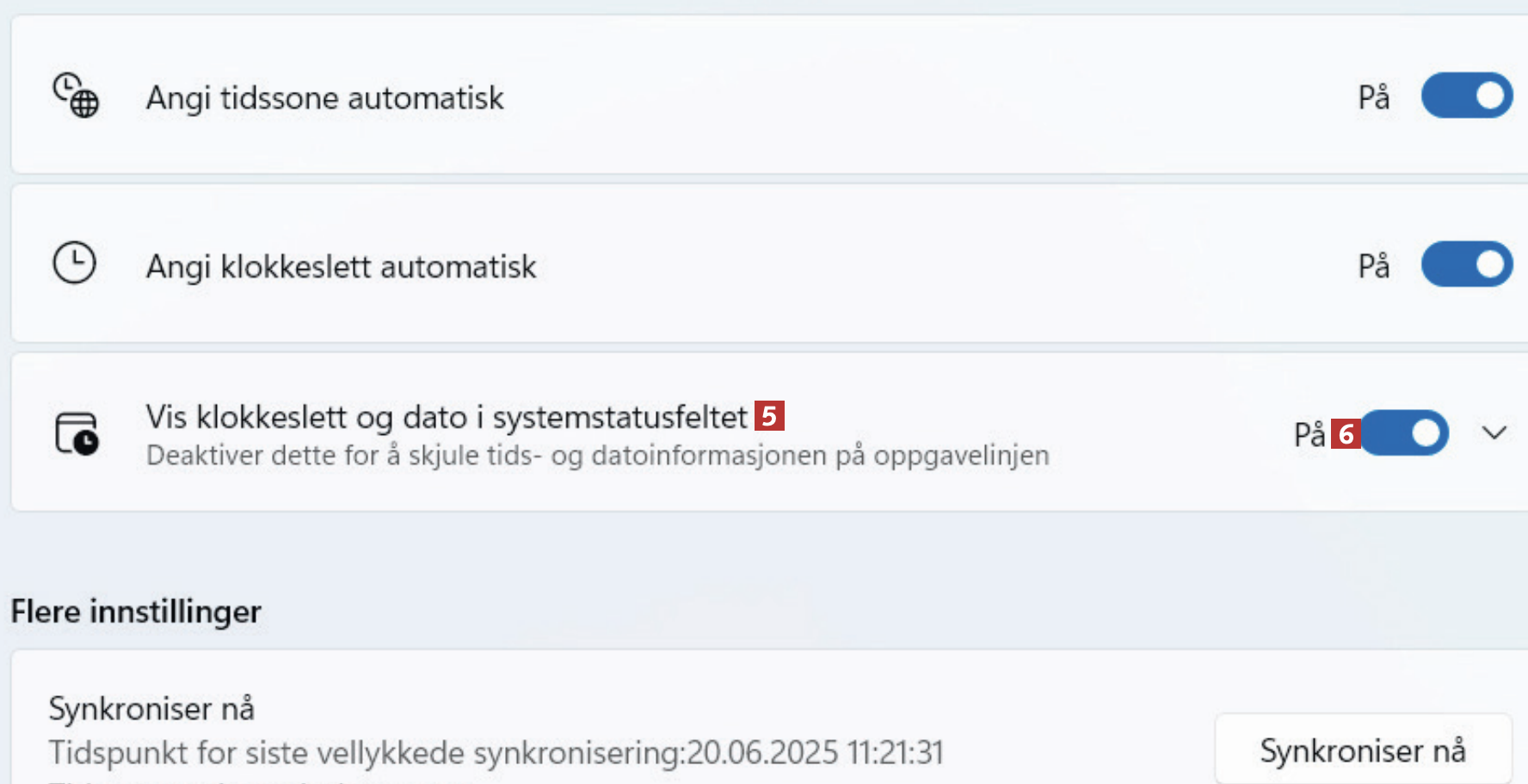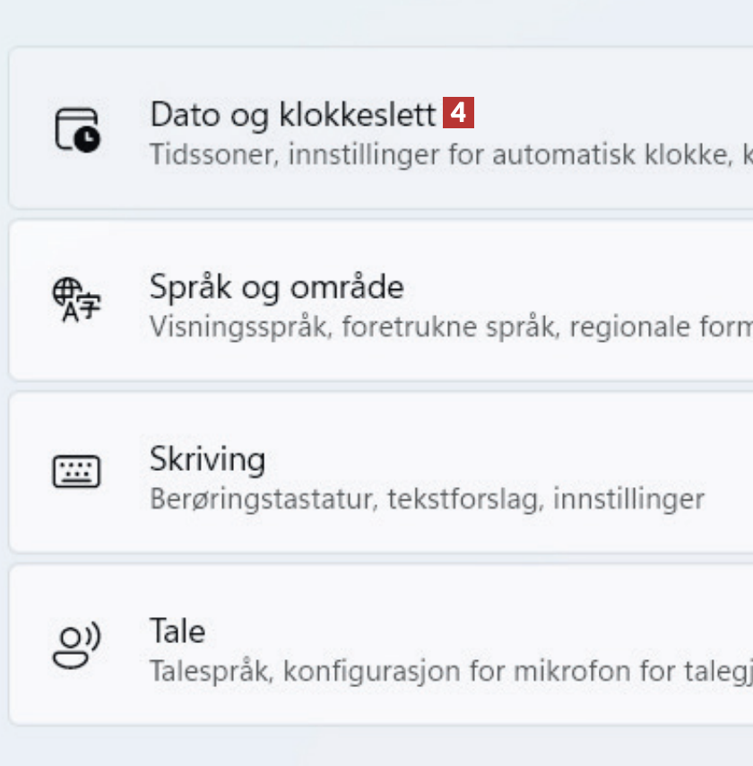 Pc-utstyr Operativsystem Windows 11 Klokken so... Klokken som forsvant Den smarte lille klokken vises ikke lenger til høyre på oppgavelinjen i Windows 11. Hvordan får jeg den tilbake? Av Redaktionen - 31. august 2025 Lagre artikkel Du skal være logget ind for at gemme artikler. You need to login, before saving articles Her får du svaret sammen med en trinn-for-trinn-guide: Svar: Problemet skyldes en feilinnstilling i Windows. Her viser vi hvordan du får klokken tilbake der den hører hjemme, altså lengst til høyre på oppgavelinjen. 1 Høyreklikk på startknappen 1 og velg Innstillinger 2. 2 Velg kategorien Tid og språk 3. 3 Deretter velger du punktet Dato og klokkeslett 4. 4 Ved Vis klokkeslett og dato i systemstatusfeltet 5 velger du På 6. 5 Dermed vises igjen klokken 7 på oppgavelinjen.