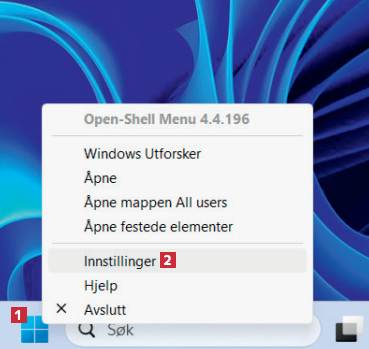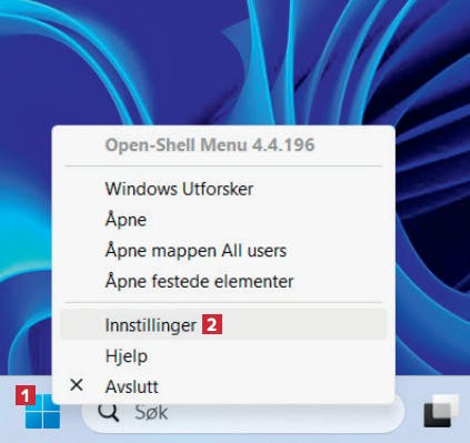 Last ned og installer Open Shell fra komputer.no. Høyreklikk på startknappen 1 i oppgavelinjen. Nå ser du en annen høyreklikkmeny enn du pleier. Velg Innstillinger 2.