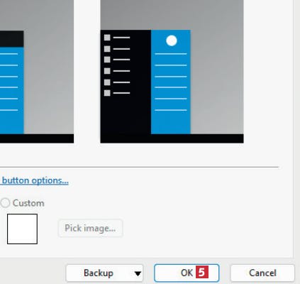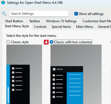 Velg mellom de tre startmenyene. Her velger vi menyen Classic with two columns. Klikk i sirkelen 4 ved menyen, slik at den markeres.