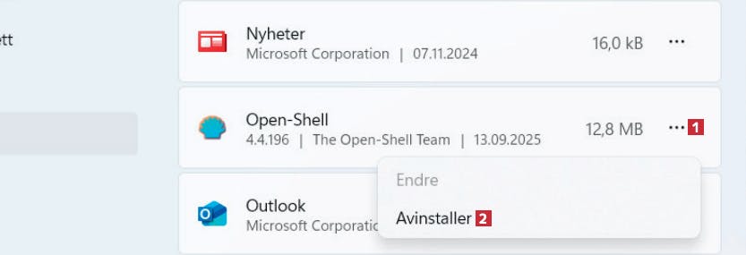 I Windows’ søkefelt skriver du Installerte apper og trykker på Enter. Da åpnes Windows-verktøyet for å avinstallere programmer. Bla ned til Open-Shell, og klikk på de tre prikkene 1 ved navnet. Klikk på Avinstaller 2 fulgt av Avinstaller en gang til i vinduet som åpnes. Følg veiviseren som åpnes, for å gjennomføre handlingen.