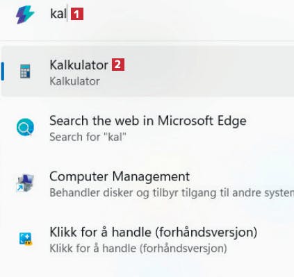 Skriv det du ønsker å søke etter, for eksempel kal 1 for å åpne verktøyet Kalkulator 2. Bruk Entertasten til å åpne programmet, eller trykk på Esc-tasten for å tømme feltet.