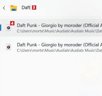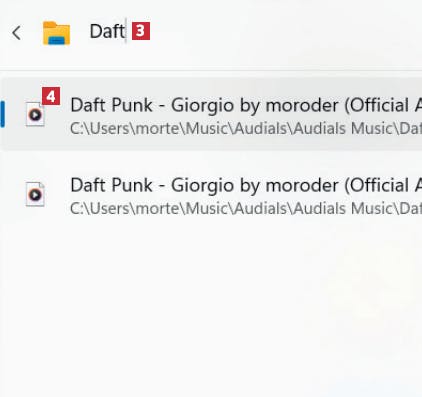 Vil du søke etter en fil på maskinen, begynner du med å skrive navnet på filnavnet, for eksempel daft 3. I dette tilfellet finner søket låter fra bandet Daft Punk 4.