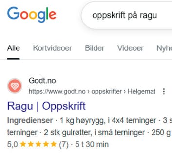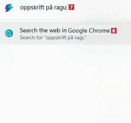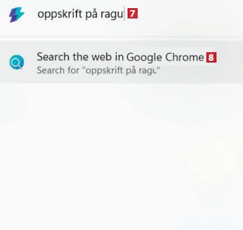 Vil du gjøre et nettsøk etter noe, skriver du ?? i søkefeltet. Når det er gjort, ser du et søkeikon 7. Skriv det du ønsker å søke etter, for eksempel oppskrift på ragu 8 og trykk Enter.