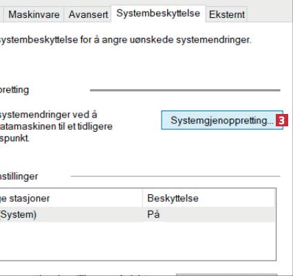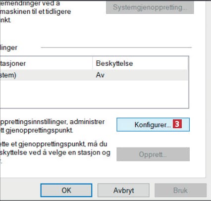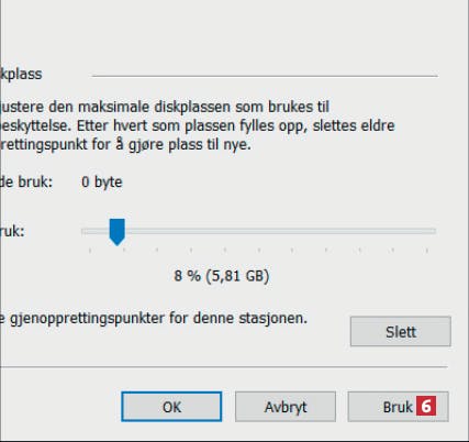 Sørg for at systembeskyttelsen er aktivert 4 . Lenger nede setter du skyveknappen slik at det tildeles minst 5 GB 5 på harddisken.