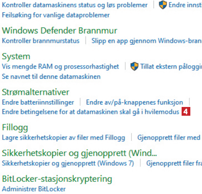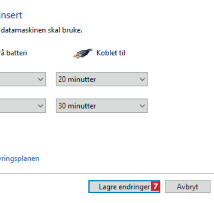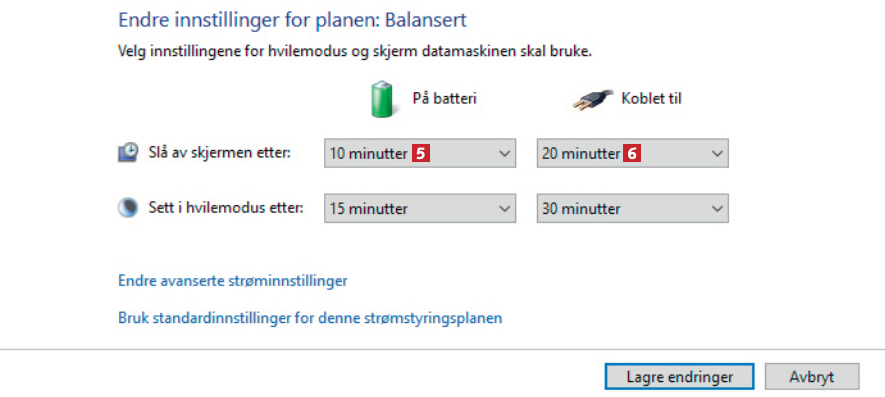 Nå har du kommet til innstillingene for hvilemodus og skjerm. I nedtrekksmenyene angir du et tidsrom for både På batteri 5 og Koblet til 6. Hos oss slås skjermen altså av først etter ti minutter ved batteridrift, og etter 20 minutter med ekstern strømforsyning.