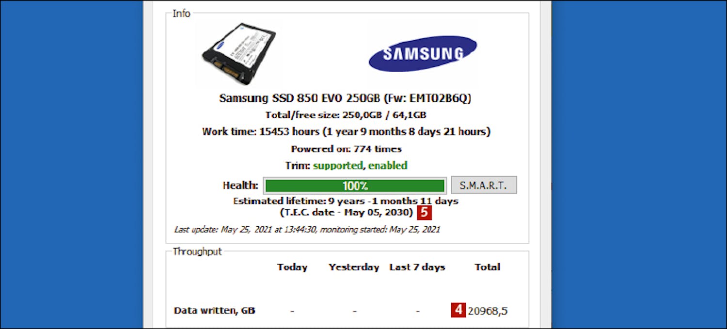 På en SSD kan de enkelte minnecellene bare overskrives et visst antall ganger, og du kan dermed beregne diskens gjenværende levetid. Dette kan du gjøre med SSD Life. Med AS SSD Benchmark kan du også teste SSD-stasjonens lese og skrivehastigheter, og se om SSD-en fortsatt er i god stand.