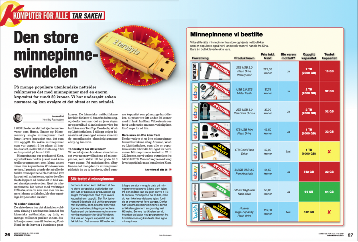 verktøyet H2testw, som du kan lese mer om i denne artikkelen, ble den egentlige kapasiteten avslørt. Vi i redaksjonen hadde en stund stusset over noen av tilbudene på minnepinner, som virket litt for gode til å være sanne. På auksjonsiden eBay finnes det mengder av minnepinner på både én og to terabyte, altså samme kapasitet som på mange harddisker, til priser fra rundt 30 kroner med fri frakt fra Kina. Vi bestemte oss for å undersøke om man virkelig kan få så mye for så lite.