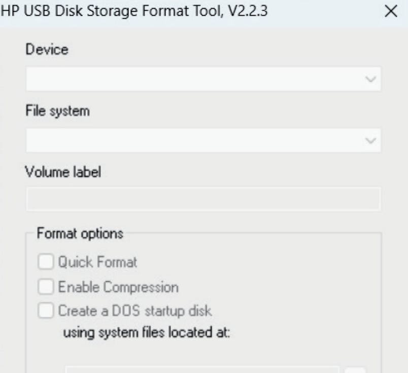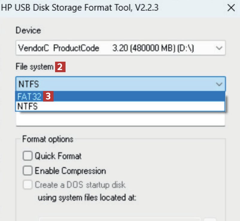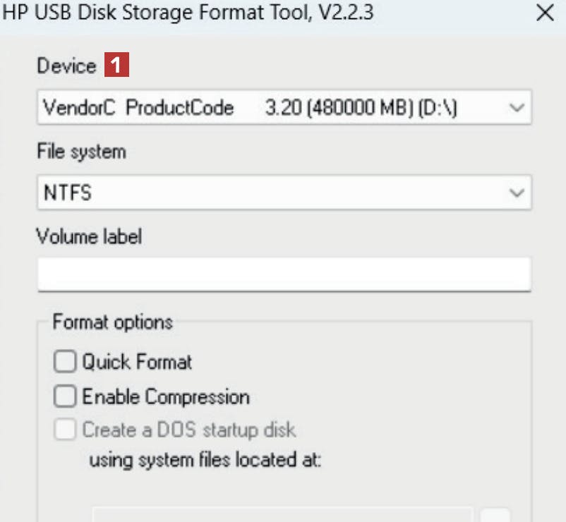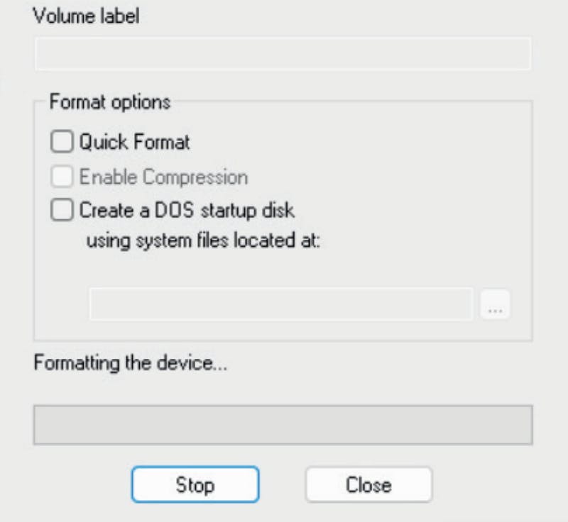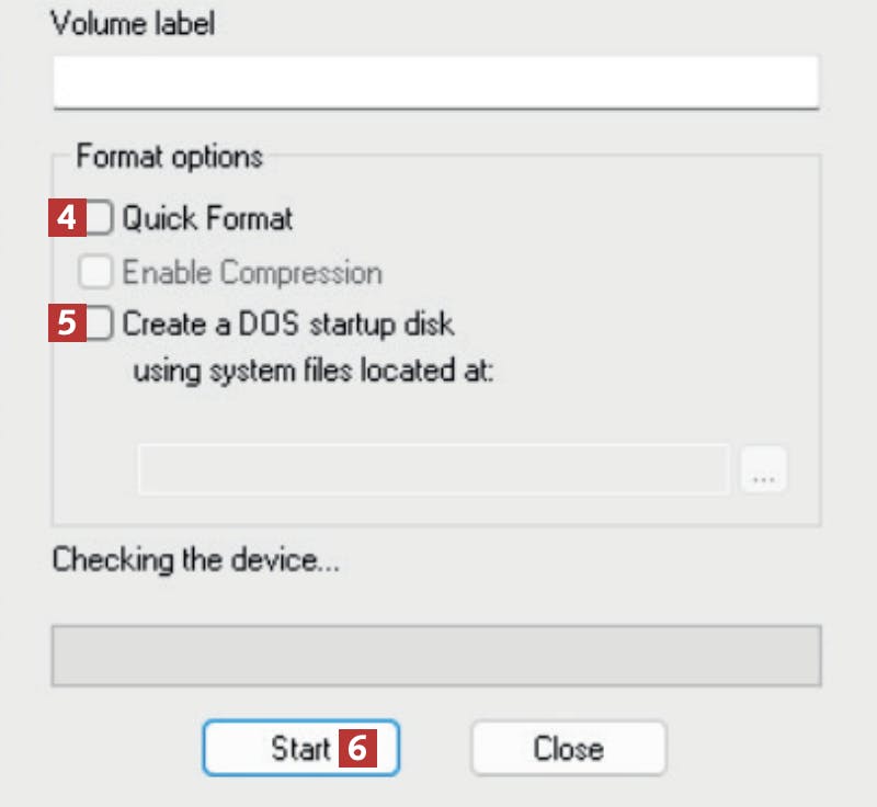 La Quick Format 4 og Create a DOS startup disk using system files located at: 5 stå uten markering. Til slutt klikker du på Start 6.