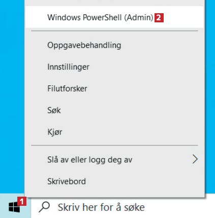 Koble minnepinnen til maskinen. Høyreklikk på startknappen 1, og velg Windows PowerShell (Admin) 2.
