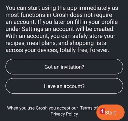 Last ned Grosh fra mobilens appbutikk. Start appen og trykk på Neste i den innledende veiledningen. Trykk på Start 1 når du ser dette bildet på skjermen.
