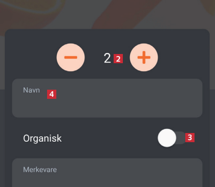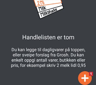Trykk på Vis liste fra hovedskjermen for å gå til handlelisten. Trykk på plusstegnet 1 for å legge til en vare på listen.