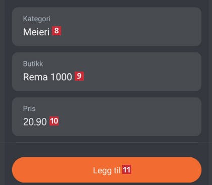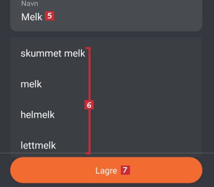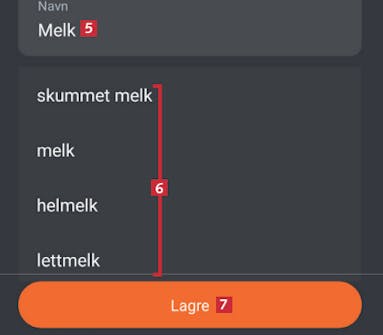 Skriv varens navn 5. Mens du skriver kommer appen med forslag 6, som du kan trykke på. Trykk på Lagre 7.