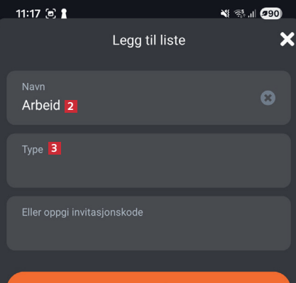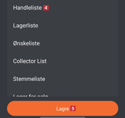 Velg hva slags liste du vil opprette. Her velger vi Handleliste 4. Trykk på Lagre 5, og velg Legg til i skjermbildet bak.