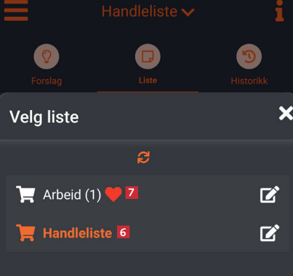 Trykk på Vis liste fra hovedskjermen for å gå til handlelisten. Deretter trykker du på Legg til liste 1 nederst. Da får du mulighet til å legge til flere handlelister.