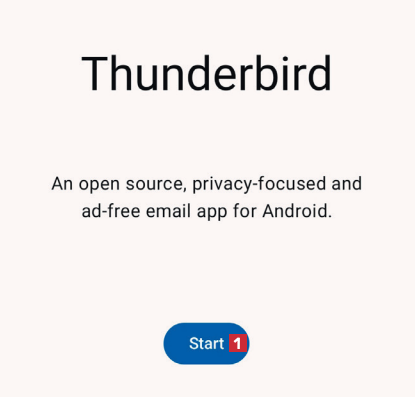 Start Thunderbird fra oversikten over installerte apper på mobilen. Trykk på Start 1 for å komme i gang med appen.
