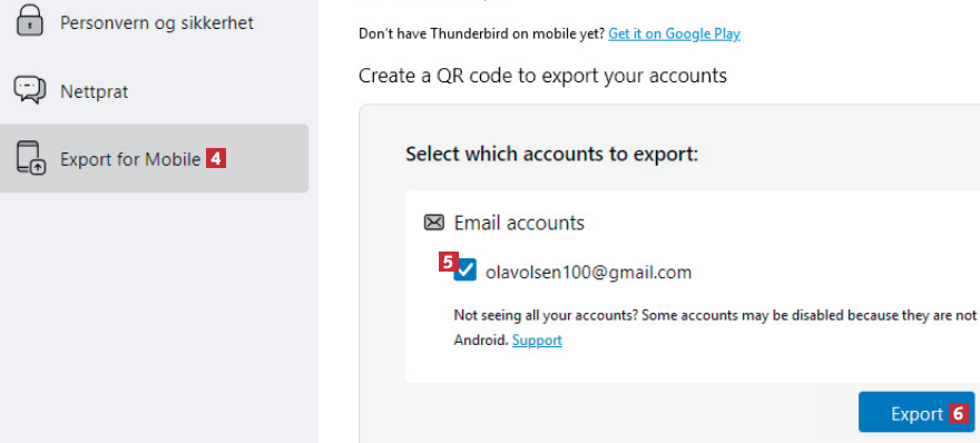 Hvis du bruker Thunderbird i Windows, kan du eksportere e-postkontoene til Thunderbird-appen på mobilen.