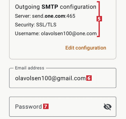Dermed finner Thunderbird selv serverinnstillingene 5. Oppgi avsenderadressen 6 og passordet til kontoen 7. Trykk på Next.