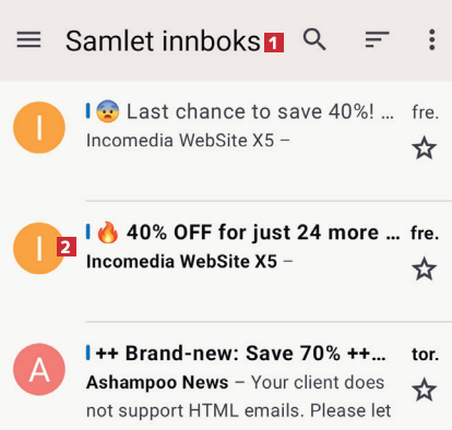 Hvis du heller vil lese e-post i separate innbokser, trykker du på de tre strekene øverst til venstre 6.