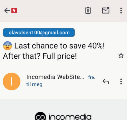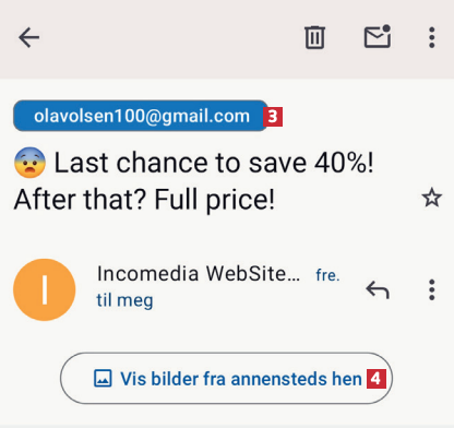 Øverst ser du adressen meldingen er sendt til 3. Av sikkerhetsgrunner vises ikke bildevedlegg automatisk. Trykk på Vis bilder fra annensteds hen 4.