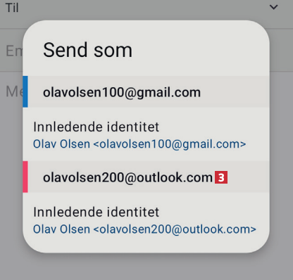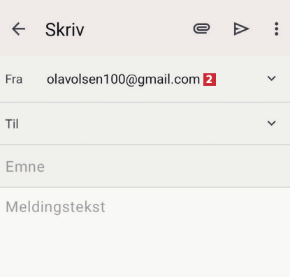 Har du flere tilknyttede e-postkontoer i appen, velger den selv en av dem som avsender. Det endrer du ved ganske enkelt å trykke på avsenderadressen 2.