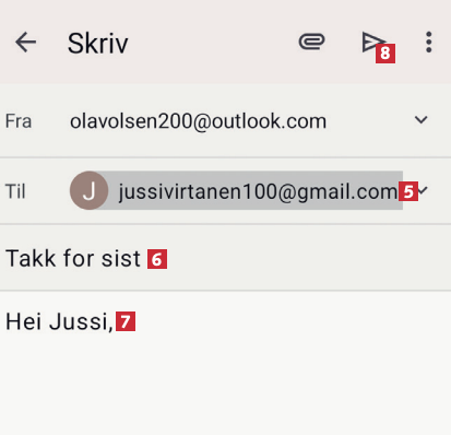 Nå fyller du ut mottakeradressen 5, emnefeltet 6 og skriver en tekst 7. Trykk på pilen for å sende e-posten 8.