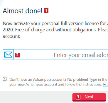 Før du kan bruke programmet, må du opprette en konto hos Ashampoo. Det koster ingenting, og her ser du hvordan du går frem. Har du allerede en konto hos Ashampoo, logger du inn på den ved å oppgi epostadressen