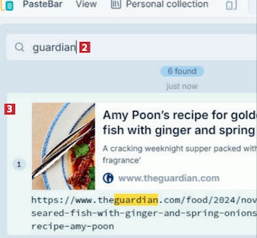 Først åpner du PasteBar. Når du har åpnet programmet, klikker du i søkefeltet 1 i det øverste venstre hjørnet av vinduet.
