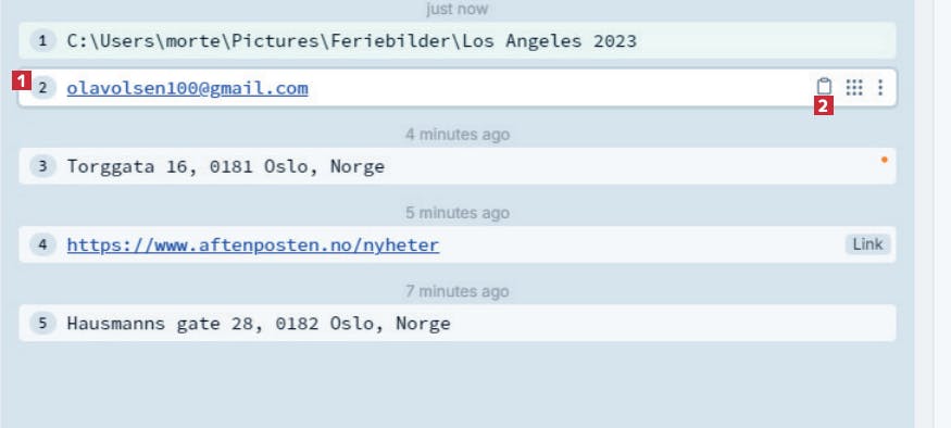 Først åpner du PasteBar og finner frem til klippet du vil fjerne fra listen. Hold musen over klippet 1, og klikk på de tre prikkene 2.