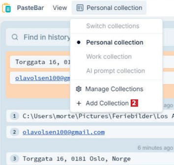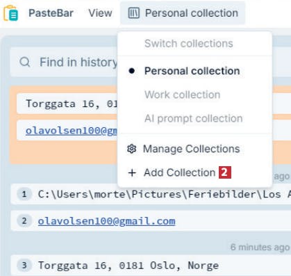 En stor fordel ved PasteBar er at du kan organisere det du har kopiert i samlinger, som du raskt kan finne og lime inn klippene fra. Du kan legge til et ubegrenset antall klipp i de enkelte samlingene.