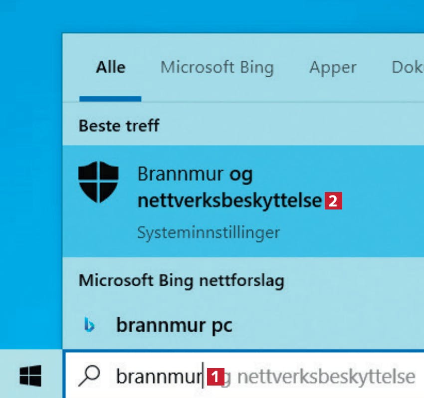 I Windows’ søkefelt skriver du først brannmur 1. Deretter klikker du på Brannmur og nettverksbeskyttelse 2 i søkeresultatene.