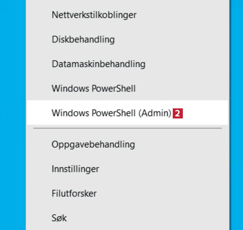 Bruker du Windows 10, velger du alternativet Windows PowerShell (Admin) 2. I Windows 11 velger du Terminal (administrator).