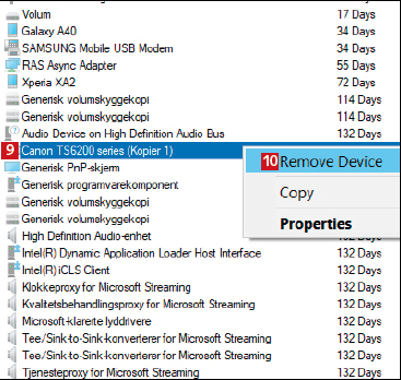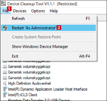 Device Cleanup Tool viser alt utstyr som er registrert i