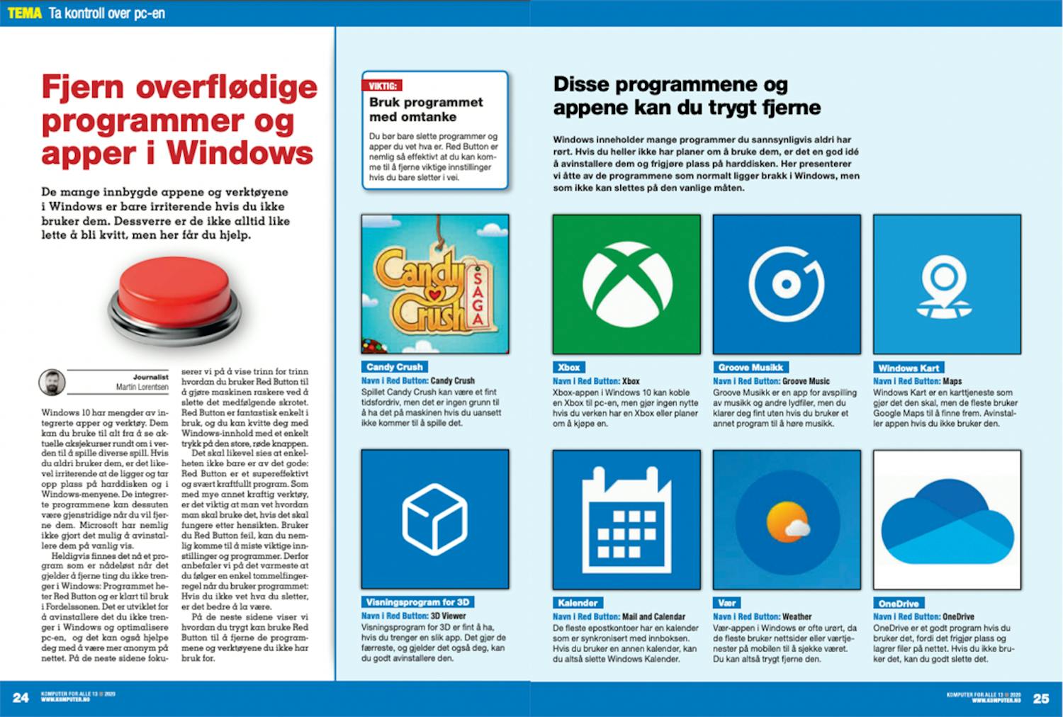 Windows 10 har mengder av integrerte apper og verktøy. Dem kan du bruke til alt fra å se aktuelle aksjekurser rundt om i verden til å spille diverse spill. Hvis du aldri bruker dem, er det likevel irriterende at de ligger og tar opp plass på harddisken og i Windows-menyene. De integrerte programmene kan dessuten være gjenstridige når du vil fjerne dem. Microsoft har nemlig ikke gjort det mulig å avinstallere dem på vanlig vis. Heldigvis finnes det nå et program som er nådeløst når det gjelder å fjerne ting du ikke trenger i Windows: Programmet heter Red Button og er klart til bruk i Fordelssonen. Det er utviklet for å slette det du ikke trenger i Windows og optimalisere pc-en, og det kan også hjelpe deg med å være mer anonym på nettet. På de neste sidene fokuserer vi på å vise trinn for trinn hvordan du bruker Red Button til å gjøre maskinen raskere ved å fjerne det medfølgende skrotet. Red Button er fantastisk enkelt i bruk, og du kan slette Windows-innhold med et enkelt trykk på den store, røde knappen.