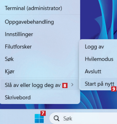 Nå må du ta en omstart. Høyreklikk på startknappen 7, og velg Slå av eller logg deg av 8 fulgt av Start på nytt 9.