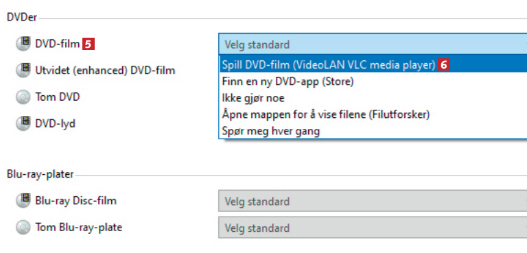 Når jeg legger en dvd i diskstasjonen, åpnes Filutforsker. Jeg vil heller at den skal spilles av med det samme i videoprogrammet VLC Media Player. Hvordan får jeg til det?