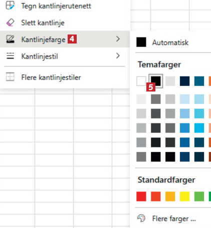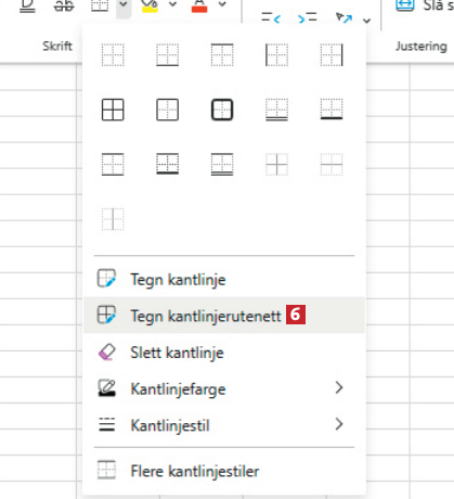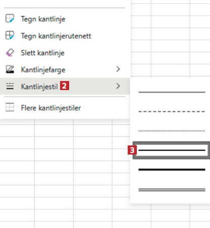 Programmer Office Excel Linjene i ... Linjene i Excel er altfor utydelige Jeg sliter med å se rutenettet i Excel 365. Er det mulig å gjøre det lettere å se? Av Redaktionen - 8. januar 2025 Lagre artikkel Du skal være logget ind for at gemme artikler. You need to login, before saving articles Her får du svaret sammen med en trinn-for-trinn-guide: SVAR Ja, du kan prøve deg frem med tykkelsen på feltkantene i innstillingene for Excel, som vist her: 1 I Excel klikker du først på ikonet for kanter 1, som ligger øverst til venstre. 2 Velg Kantlinjestil 2, og klikk på en passende tykkelse 3. 3 Med Kantlinjefarge 4 kan du velge en farge 5 du synes er lettere å se. 4 Velg Tegn kantlinjerutenett 6 i samme meny 5 Nu kan du trække en ramme om det område 7 i arket, som du vil give tydeligere rammer.