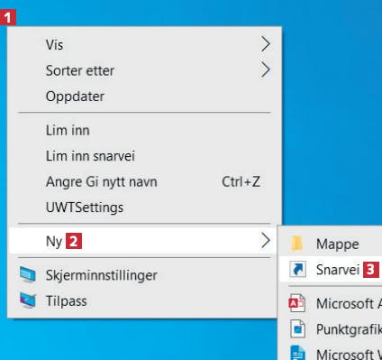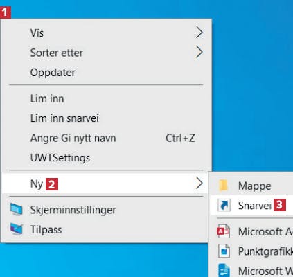 Hvis du vil opprette en snarvei til et program, må du først høyreklikke på skrivebordet 1 og flytte musepekeren ned til Ny 2. Deretter klikker du på Snarvei 3.