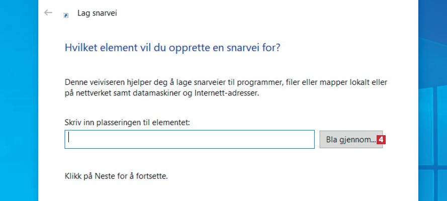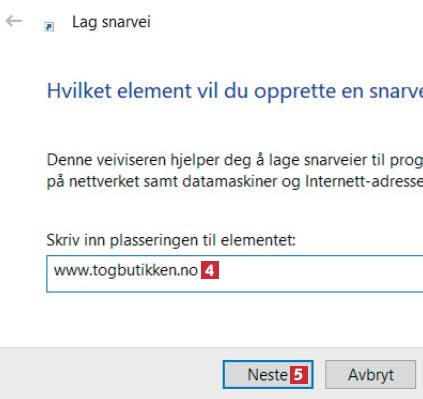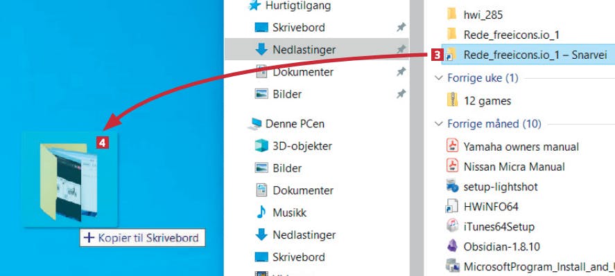 Dermed er snarveien klar og merket som sådan med en liten pil på ikonet. Dra snarveien 3 fra utforskeren og ut på skrivebordet 4.