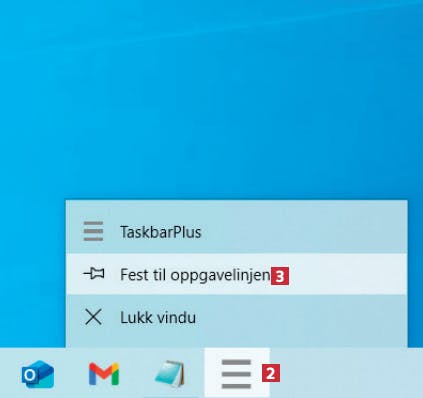 Nå legger programmet seg på oppgavelinjen i Windows. Høyreklikk på programikonet 2, og velg Fest til oppgavelinjen 3. Klikk deretter på ikonet 2 på oppgavelinjen.