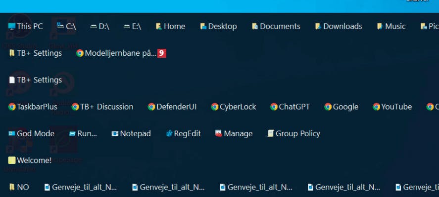 Når du har opprettet snarveiene i Windows, kan du få orden på dem med programmet TaskbarPlus. Da får du et panel nederst på skjermen der alle snarveiene er samlet på ett sted.