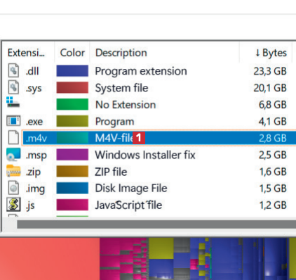 I listen over filtyper kan du for eksempel klikke på M4V 1, som her legger beslag på 2,8 gigabyte.