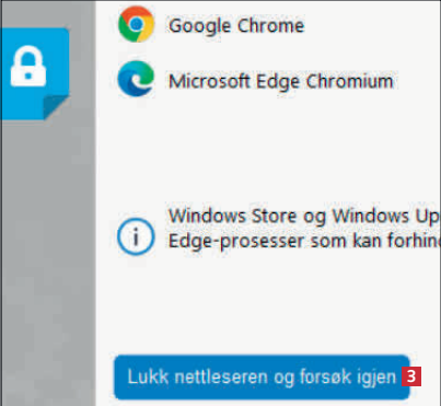 Hvis en eller flere av nettleserne er åpne, klikker du på Lukk nettleseren og prøv igjen 3, slik at programmet kan få tilgang til låste informasjonskapsler og andre filer.