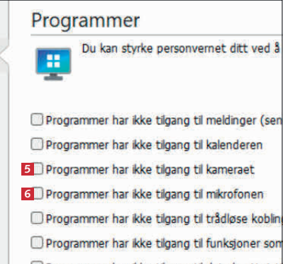 Velg deretter Programmer på venstre side. Her kan du sørge for at installerte programmer ikke får tilgang til maskinens nettkamera 5 og mikrofon 6.